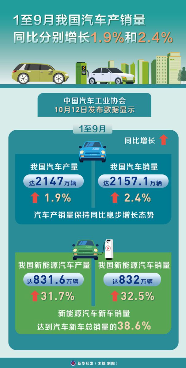 1至9月,我國(guó)新能源汽車(chē)產(chǎn)銷量達(dá)831.6萬(wàn)輛和832萬(wàn)輛,同比分別增長(zhǎng)31.7%和32.5%,新能源汽車(chē)新車(chē)銷量達(dá)到汽車(chē)新車(chē)總銷量的38.6%。